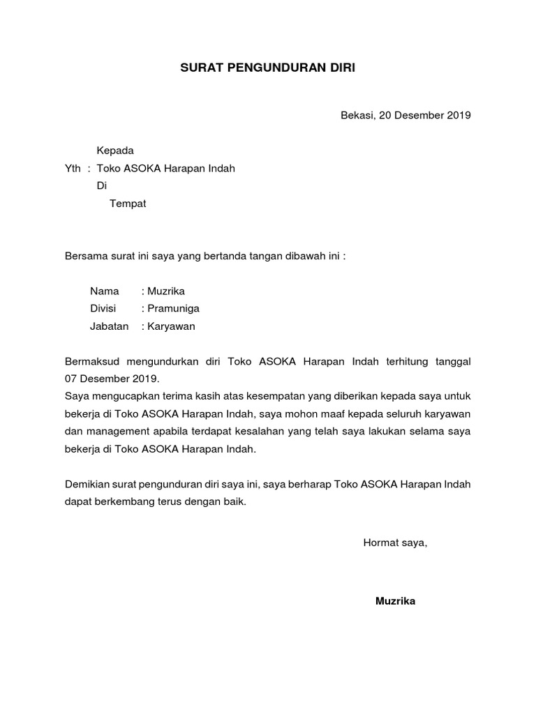Contoh Surat Pengunduran Diri Kerja Di Toko Contoh Surat